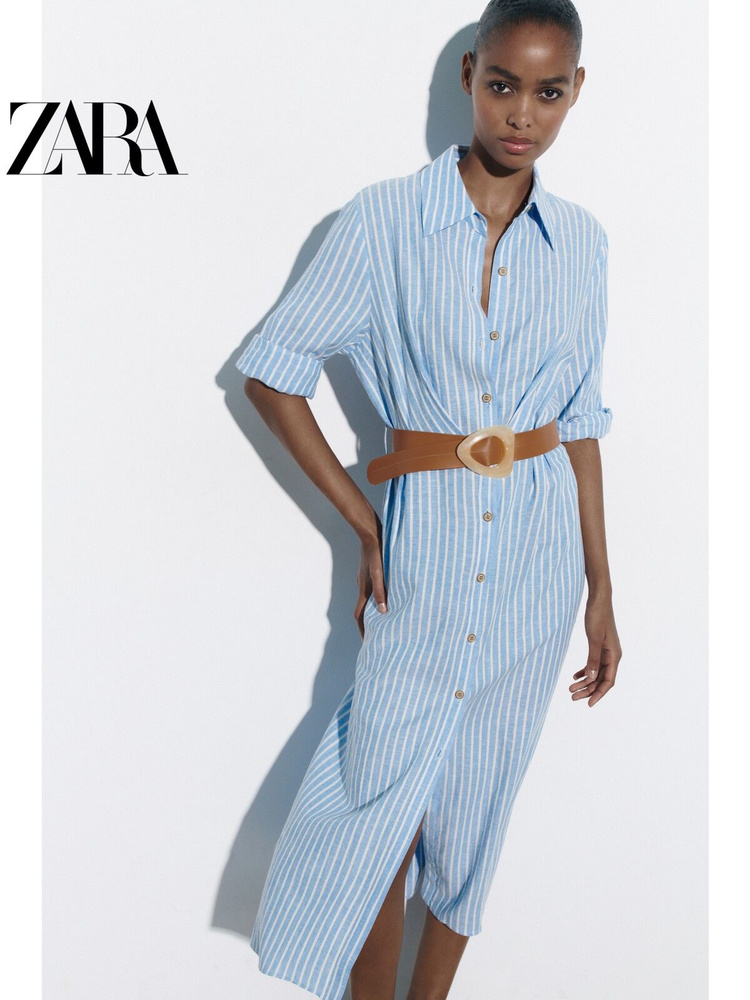 ZARA новая мода полосатая рубашка с поясом и украшением платье женское